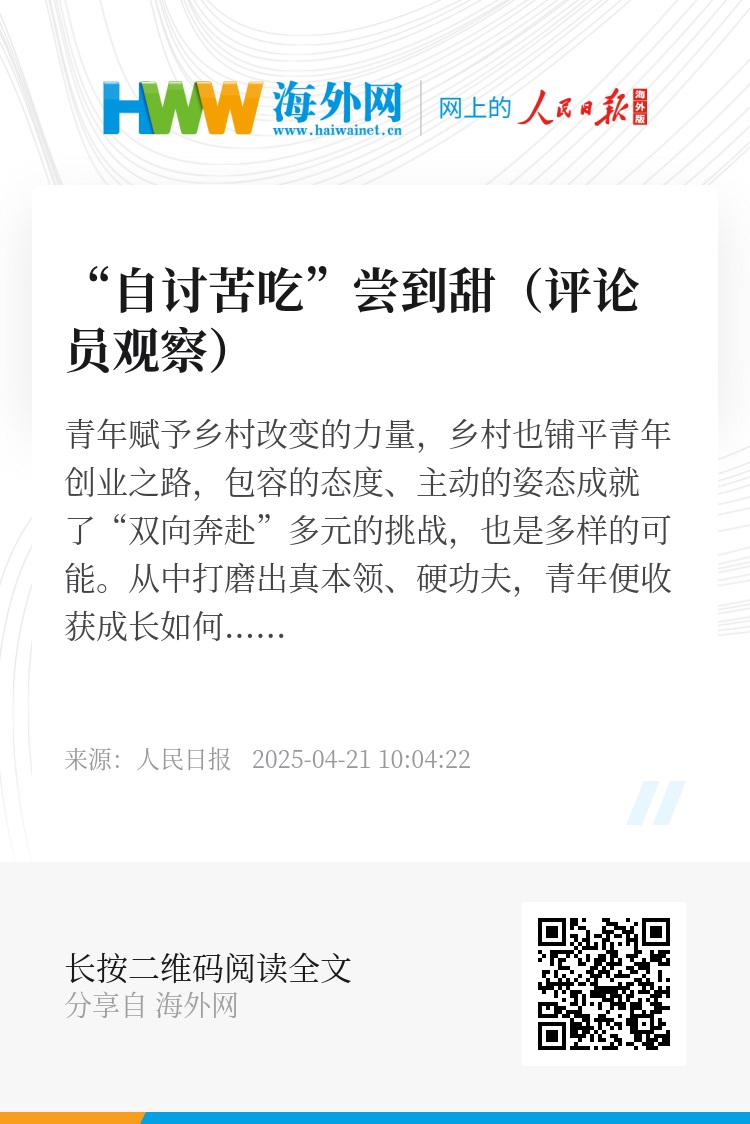 选择乡村,并非“不知苦”的莽撞。青年的智慧能为农业农村发展注活水、添活力,正是这份成就感,让他们“明知有苦、偏向苦行”。