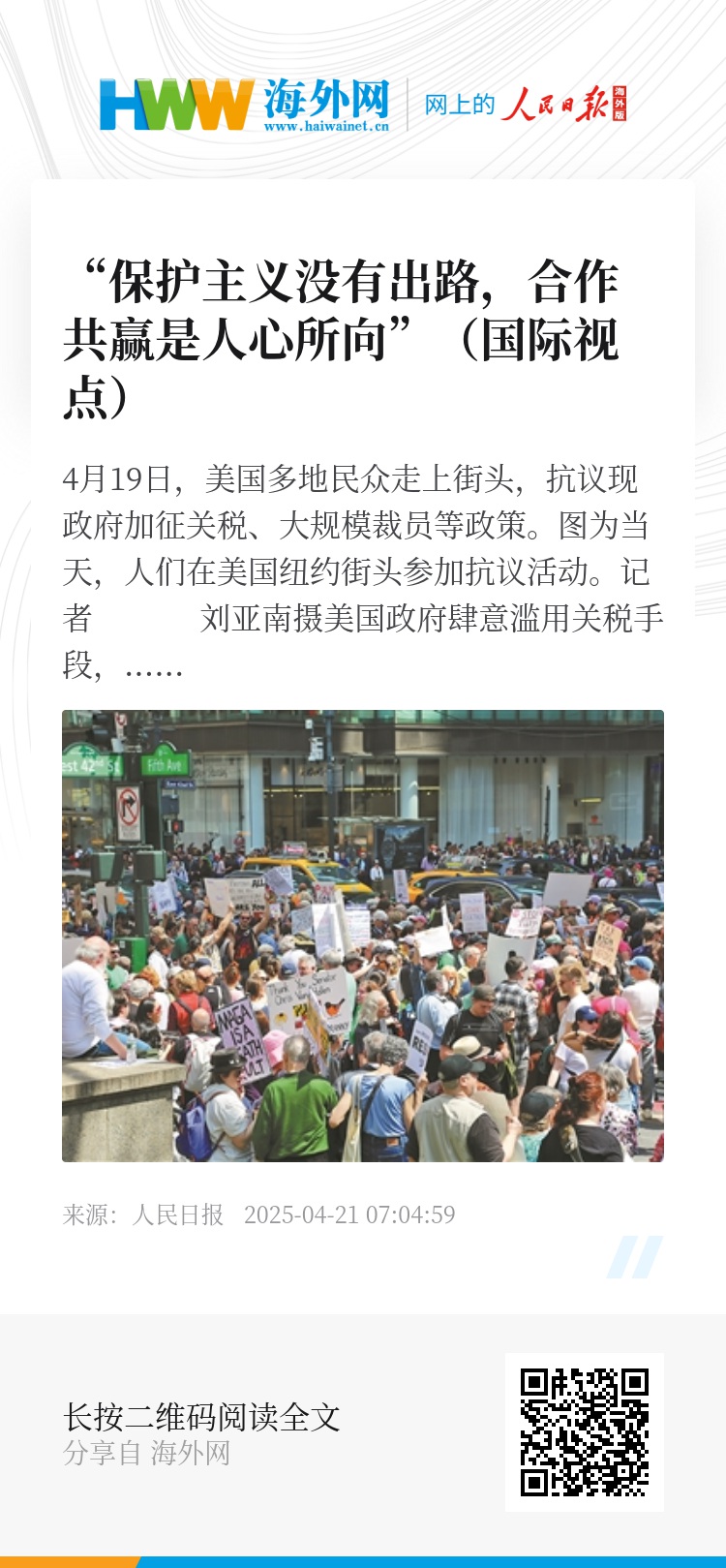 美方滥施关税措施招致美国国内越来越多的反对声音,担忧情绪在民众中不断蔓延。美国哥伦比亚广播公司与舆观调查公司的一项最新民调结果显示,58%的受访美国民众表示反对美国关税政策,53%的受访者认为美国国会应该阻止或限制新关税,58%的受访者认为关税政策导致食品杂货价格上涨。4月19日,美国多地举行抗议活动,首都华盛顿、纽约、旧金山、波士顿等城市的民众走上街头,抗议现政府加征关税、大规模裁员、驱逐移民等政策。