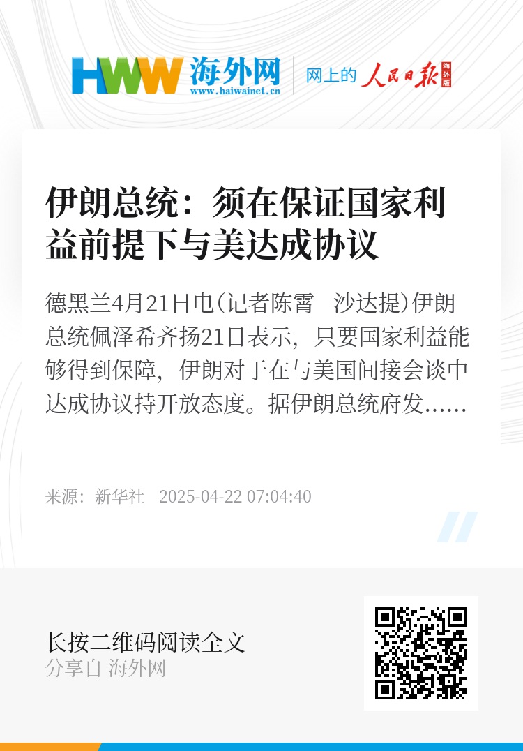 新华社德黑兰4月21日电(记者陈霄 沙达提)伊朗总统佩泽希齐扬21日表示,只要国家利益能够得到保障,伊朗对于在与美国间接会谈中达成协议持开放态度。