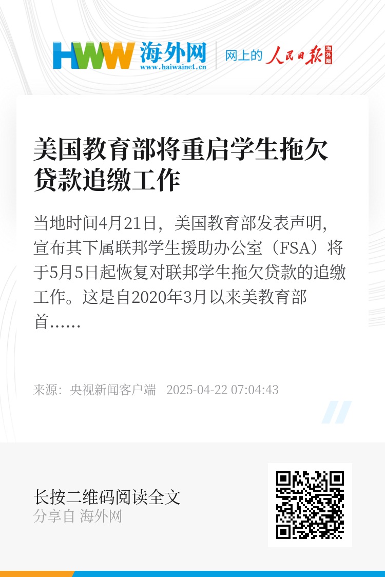 当地时间4月21日,美国教育部发表声明,宣布其下属联邦学生援助办公室(FSA)将于5月5日起恢复对联邦学生拖欠贷款的追缴工作。这是自2020年3月以来美教育部首次重启相关行动。