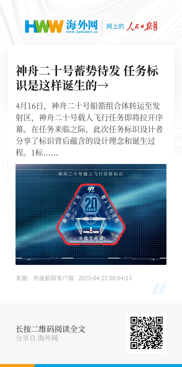 4月16日,神舟二十号船箭组合体转运至发射区,神舟二十号载人飞行任务即将拉开序幕。在任务来临之际,此次任务标识设计者分享了标识背后蕴含的设计理念和诞生过程。