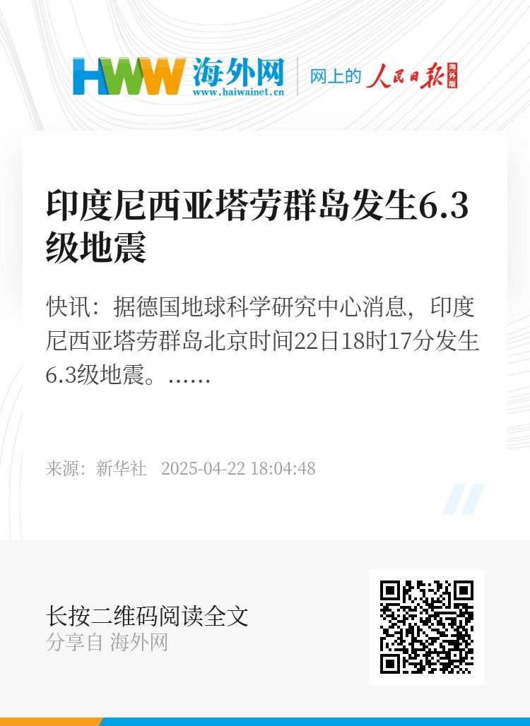 新华社快讯:据德国地球科学研究中心消息,印度尼西亚塔劳群岛北京时间22日18时17分发生6.3级地震。