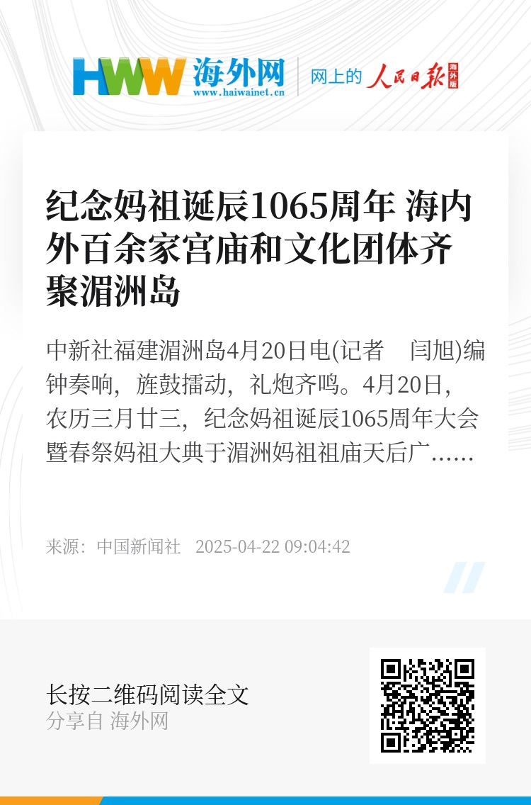 记者了解到,今年以来已有105万人次的各地妈祖敬仰者奔赴湄洲岛,掀起“天下妈祖回娘家”热潮。为纪念妈祖诞辰1065周年,湄洲妈祖祖庙董事会精心策划并开展了系列纪念活动。林金赞透露,今年祖庙将继续筹划举办更多妈祖信俗活动,推动妈祖文化国际化传播,同时做好两岸妈祖信俗标准共通。