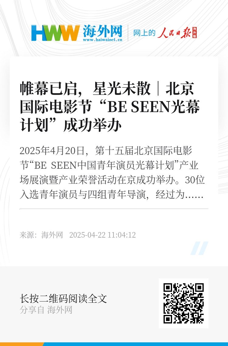 2025年4月20日,第十五届北京国际电影节“BE SEEN中国青年演员光幕计划”产业场展演暨产业荣誉活动在京成功举办。30位入选青年演员与四组青年导演,经过为期16天的封闭式集训营训练,共同为观众呈现《看不见的客人》《错位》《保密局的枪声》《何必呢,何毕》四部改编剧目,以舞台为镜,折射中国电影新生代的演员力量。