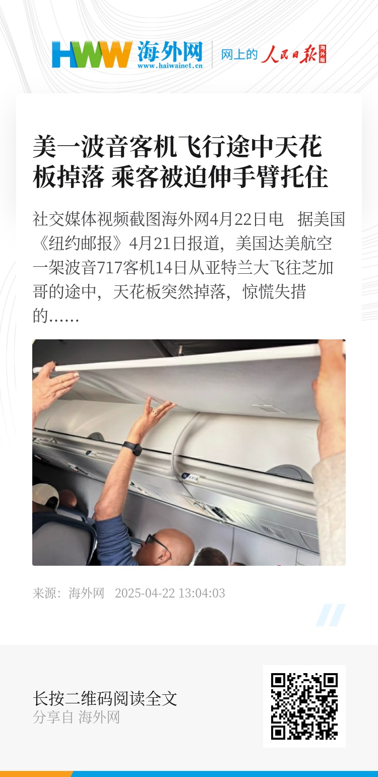 海外网4月22日电 据美国《纽约邮报》4月21日报道,美国达美航空一架波音717客机14日从亚特兰大飞往芝加哥的途中,天花板突然掉落,惊慌失措的旅客被迫支撑着机顶面板。