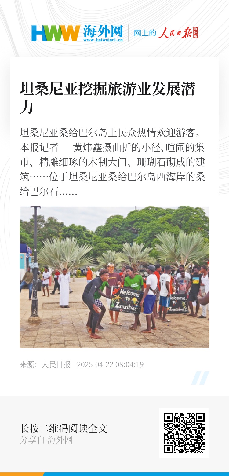 桑给巴尔岛是坦桑尼亚的热门旅游目的地。坦桑尼亚拥有众多壮美的自然景观,国土面积约1/3是国家公园及各类保护区。生活着300多万只大型哺乳动物的塞伦盖蒂国家公园连续6年荣膺“非洲最佳国家公园”称号,被联合国环境规划署世界保护监测中心誉为“世界现存最大的动物迁徙地”。乞力马扎罗山多次获得“非洲最佳旅游景点”称号。桑给巴尔岛既有白沙滩、玻璃海等自然风光,也有石头城、种植园等人文景观。近年来,坦桑尼亚旅游业发展势头良好。据世界经济论坛旅游竞争力指数,坦桑尼亚自然旅游资源质量排名非洲首位、世界第十二位。坦桑尼亚自然资源和旅游部部长查娜日前发布报告称,坦桑尼亚2024年接待游客数量创纪录地达到536万人次。其中,桑给巴尔岛旅游业对坦桑尼亚国内生产总值贡献率达27%,旅游收入占外汇收入的80%以上。