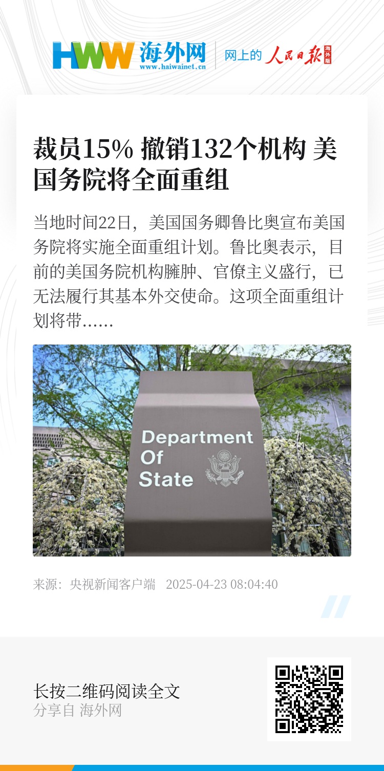 当地时间22日,美国国务卿鲁比奥宣布美国务院将实施全面重组计划。