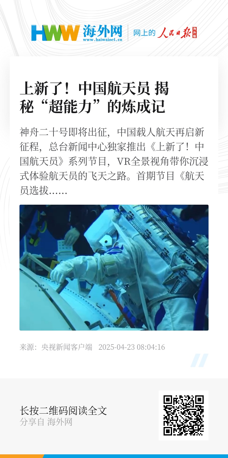 神舟二十号即将出征,中国载人航天再启新征程,总台新闻中心独家推出《上新了!中国航天员》系列节目,VR全景视角带你沉浸式体验航天员的飞天之路。