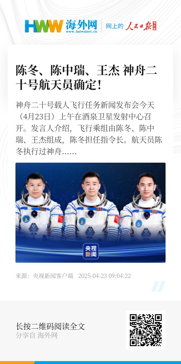 神舟二十号载人飞行任务新闻发布会今天(4月23日)上午在酒泉卫星发射中心召开。发言人介绍,飞行乘组由陈冬、陈中瑞、王杰组成,陈冬担任指令长。