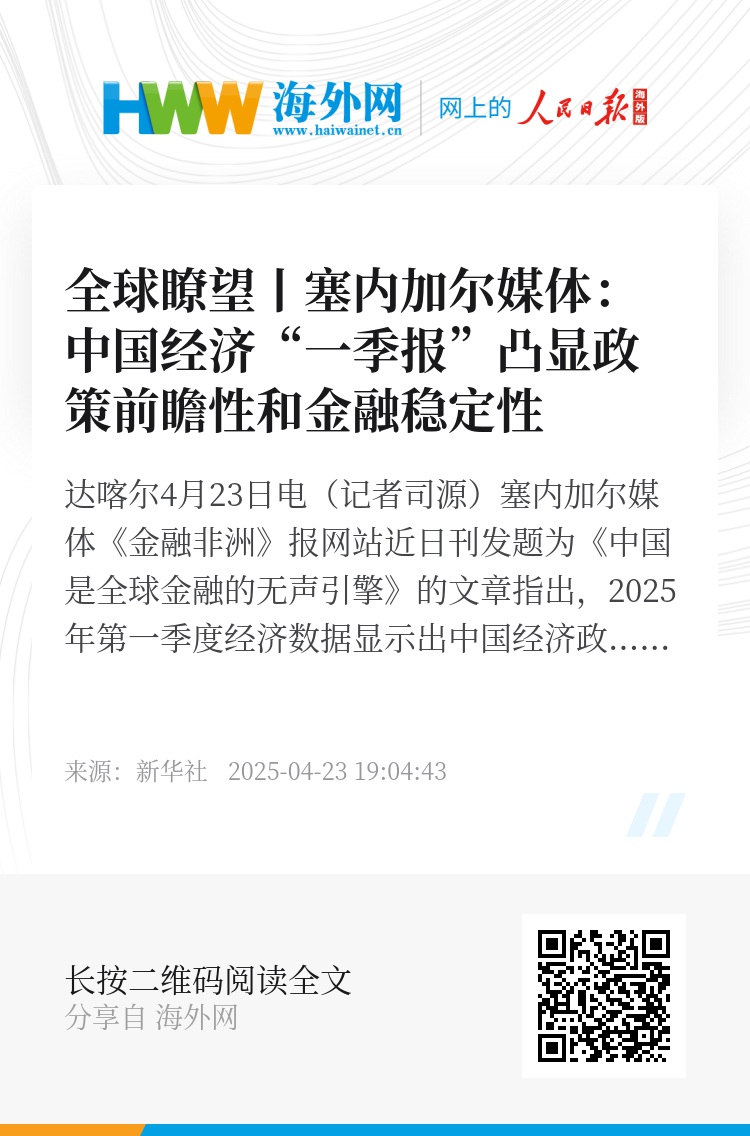 新华社达喀尔4月23日电(记者司源)塞内加尔媒体《金融非洲》报网站近日刊发题为《中国是全球金融的无声引擎》的文章指出,2025年第一季度经济数据显示出中国经济政策的前瞻性与金融体系的稳定性。文章摘要如下: