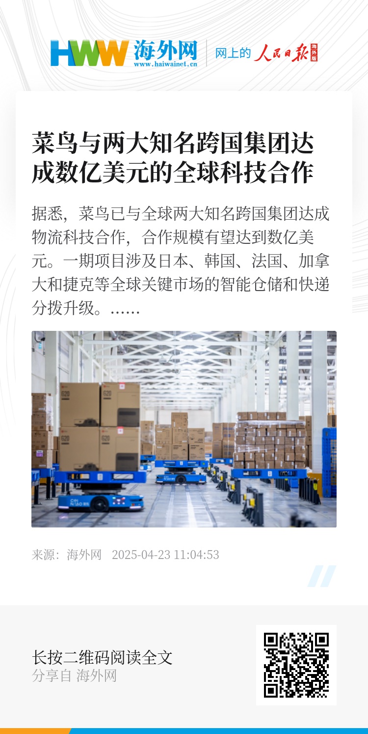 据悉,菜鸟已与全球两大知名跨国集团达成物流科技合作,合作规模有望达到数亿美元。一期项目涉及日本、韩国、法国、加拿大和捷克等全球关键市场的智能仓储和快递分拨升级。