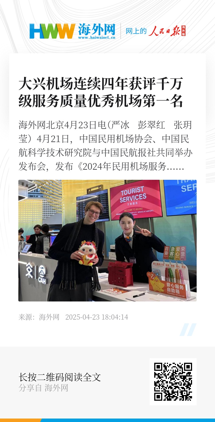 海外网北京4月23日电(严冰 彭翠红 张玥莹)4月21日,中国民用机场协会、中国民航科学技术研究院与中国民航报社共同举办发布会,发布《2024年民用机场服务质量评价报告》,北京大兴国际机场以综合得分第一的成绩,获评1000万以上量级“服务质量优秀机场”,这也是大兴机场连续第四年获此成绩,充分体现了行业内外对大兴机场服务质量的高度认可和肯定。