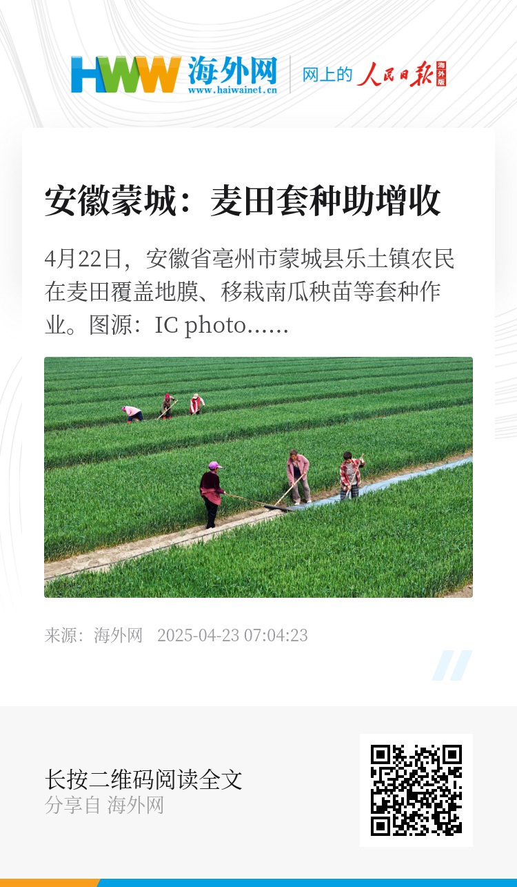 32856866,.安徽蒙城:麦田套种助增收,.2025-04-23 07:04:23,.204441,.张荣耀、李萌