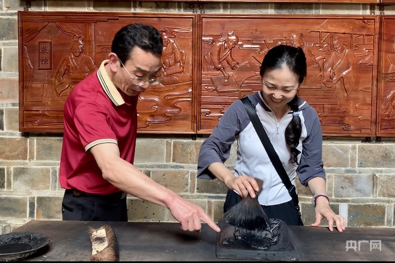 黄行忠(左)指导游客体验雕版印刷(央广网记者 罗晓英 摄)