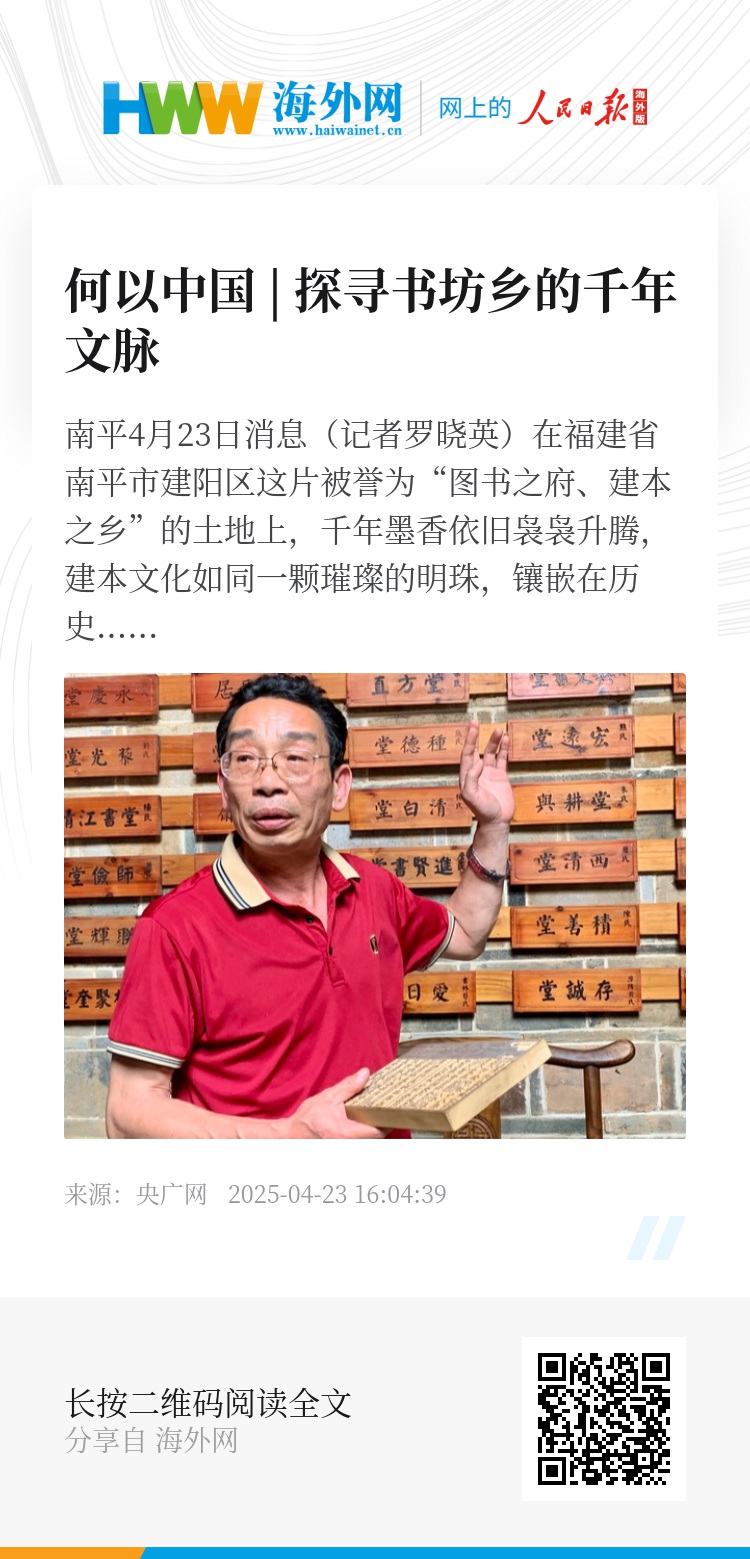 央广网南平4月23日消息(记者罗晓英)在福建省南平市建阳区这片被誉为“图书之府、建本之乡”的土地上,千年墨香依旧袅袅升腾,建本文化如同一颗璀璨的明珠,镶嵌在历史的长河中,熠熠生辉。近日,记者走进建本文化的发源地——建阳区书坊乡,踏上了一场探寻千年文脉的旅程。