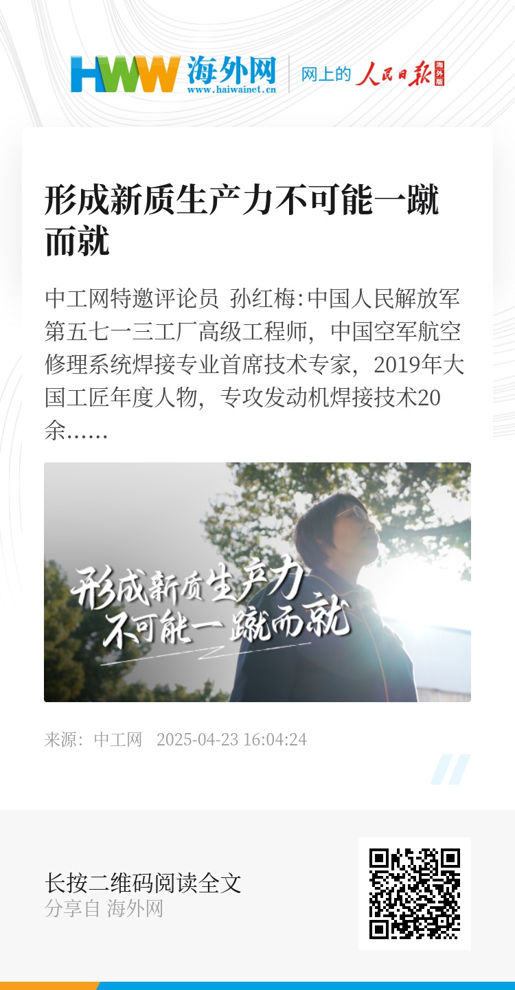 新时代新征程,发展新质生产力,既要有只争朝夕的速度,又要有持之以恒的定力。我们将继续坚守在航空维修一线,秉持工匠精神、永攀技术高峰。我也期待,更多的年轻人能够积极投身科技创新事业,为实现科技强国梦贡献青春力量。