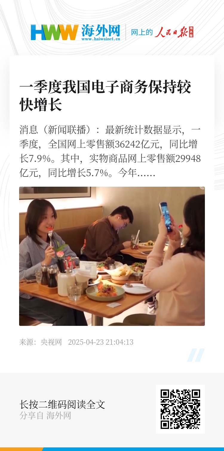 央视网消息(新闻联播):最新统计数据显示,一季度,全国网上零售额36242亿元,同比增长7.9%。其中,实物商品网上零售额29948亿元,同比增长5.7%。