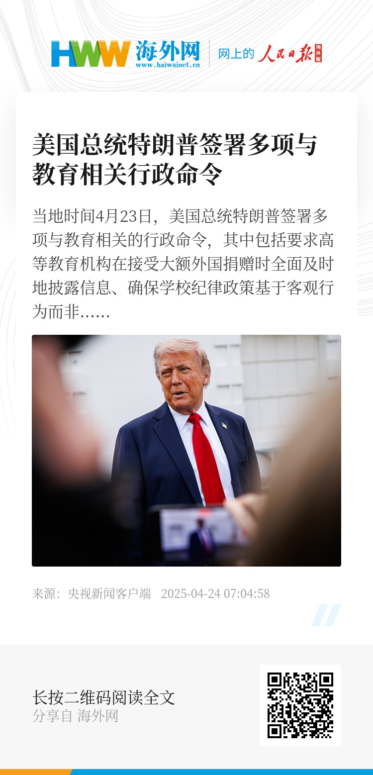 当地时间4月23日,美国总统特朗普签署多项与教育相关的行政命令,其中包括要求高等教育机构在接受大额外国捐赠时全面及时地披露信息、确保学校纪律政策基于客观行为而非“多元化、平等、包容”(DEI)以恢复美国课堂的安全和秩序等。