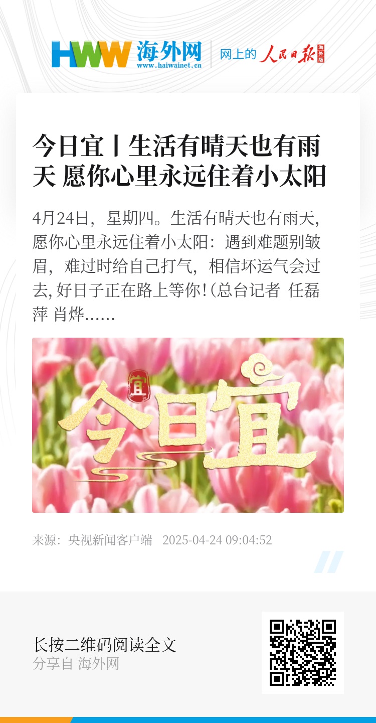 4月24日,星期四。生活有晴天也有雨天,愿你心里永远住着小太阳:遇到难题别皱眉,难过时给自己打气,相信坏运气会过去,好日子正在路上等你!(总台记者 任磊萍 肖烨)