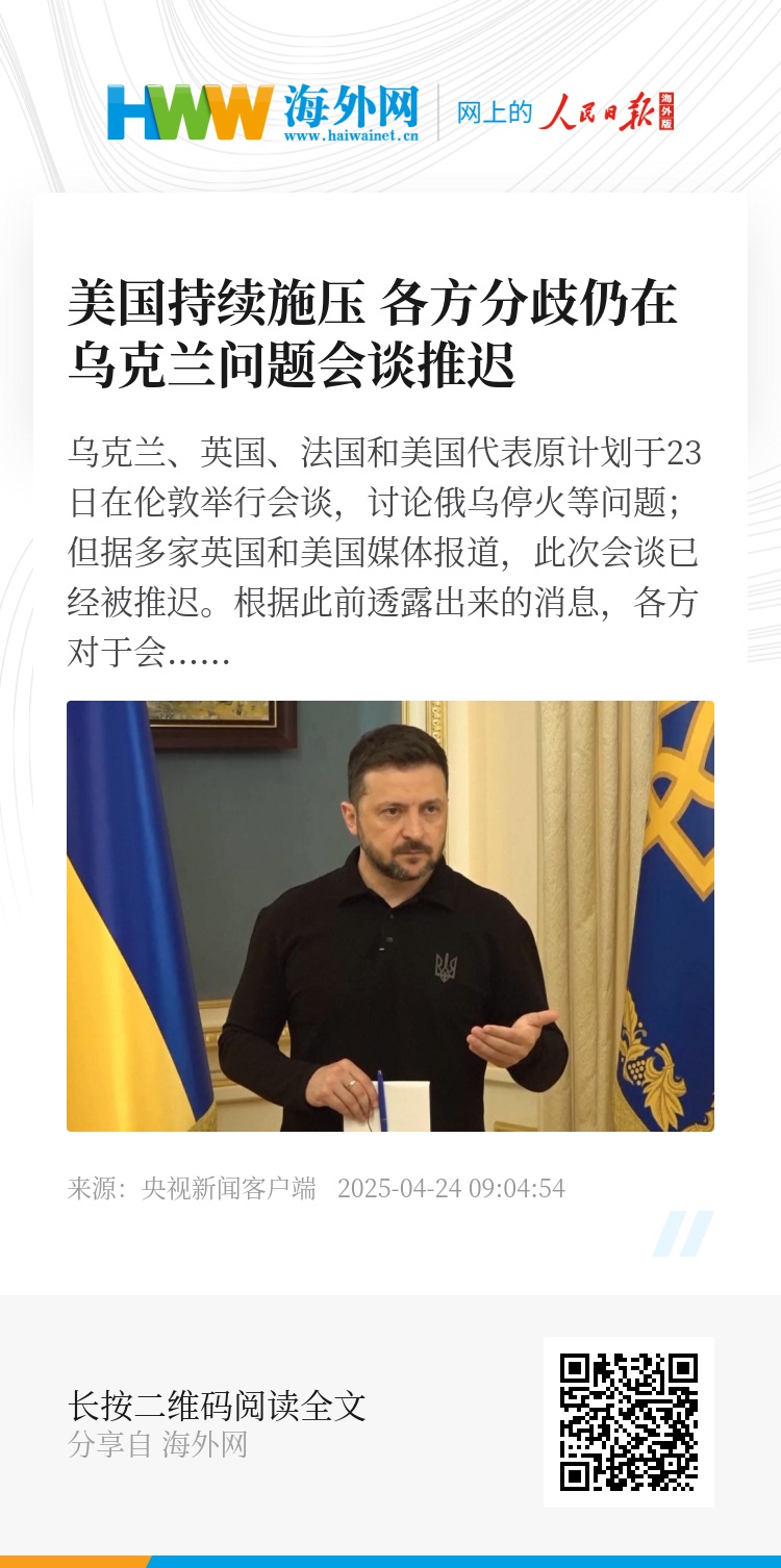 据英国天空新闻网23日报道,此次会谈被推迟的原因,与美方对俄乌持续施压有关。美方此前提出的停火协议框架中,包括领土问题以及乌克兰不加入北约等内容,但这一提议遭到乌克兰总统泽连斯基的拒绝。