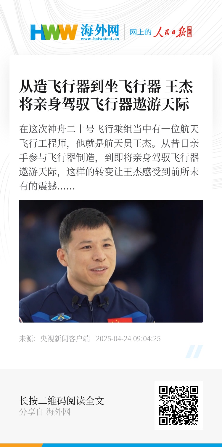 在这次神舟二十号飞行乘组当中有一位航天飞行工程师,他就是航天员王杰。从昔日亲手参与飞行器制造,到即将亲身驾驭飞行器遨游天际,这样的转变让王杰感受到前所未有的震撼。然而,无论身份如何转换,他那份成为航天人探索浩瀚宇宙的梦想,始终如一。