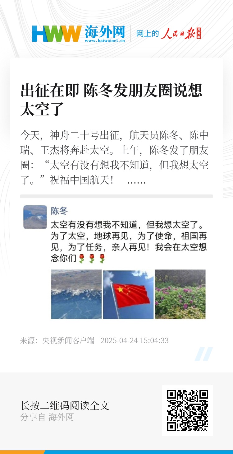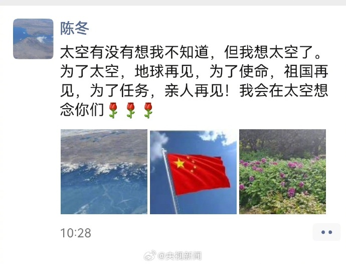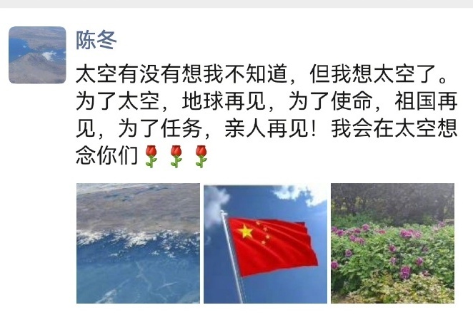上午,陈冬发了朋友圈:“太空有没有想我不知道,但我想太空了。”祝福中国航天!