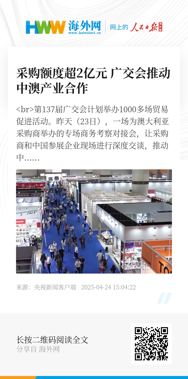 第137届广交会计划举办1000多场贸易促进活动。昨天(23日),一场为澳大利亚采购商举办的专场商务考察对接会,让采购商和中国参展企业现场进行深度交谈,推动中澳产业合作。