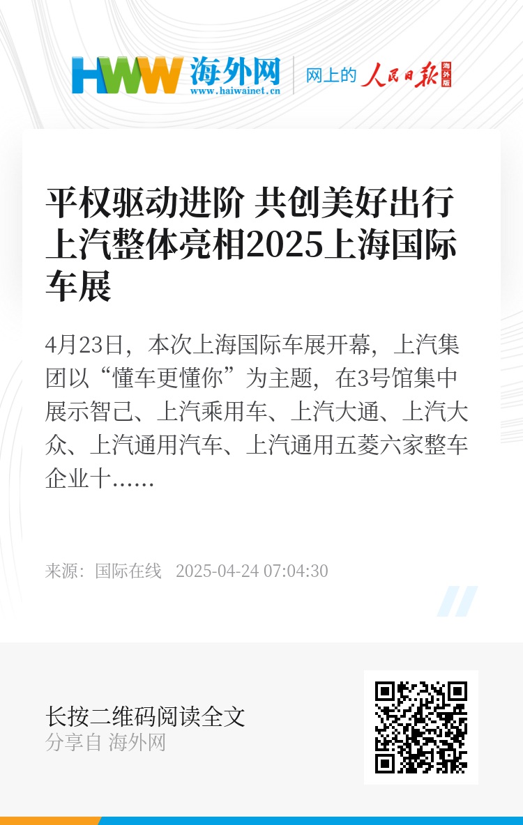此次车展期间,上汽集团围绕“平权驱动进阶 共创美好出行”发展理念,集中发布品牌焕新、“Glocal全球视野 本土匠心”等战略;同时,上汽与华为共同打造的全新品牌“SAIC尚界”作为华为智选车模式的最新成员正式亮相车展,以“风格至尚、科技至尚、信赖至尚、人人至尚”为品牌主张,搭载华为智慧出行解决方案,并通过上汽高端精密的制造能力、全球制造标准,以及鸿蒙智行严苛的质量管理体系,专注为消费者打造超耐用、高安全和高可靠的车辆,为千家万户打造高品质的出行生活。