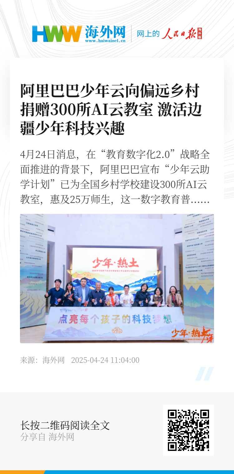4月24日消息,在“教育数字化2.0”战略全面推进的背景下,阿里巴巴宣布“少年云助学计划”已为全国乡村学校建设300所AI云教室,惠及25万师生,这一数字教育普惠工程,正依托AI大模型、云计算等技术,通过云端算力与人工智能的深度融合,为教育公平注入科技动能。