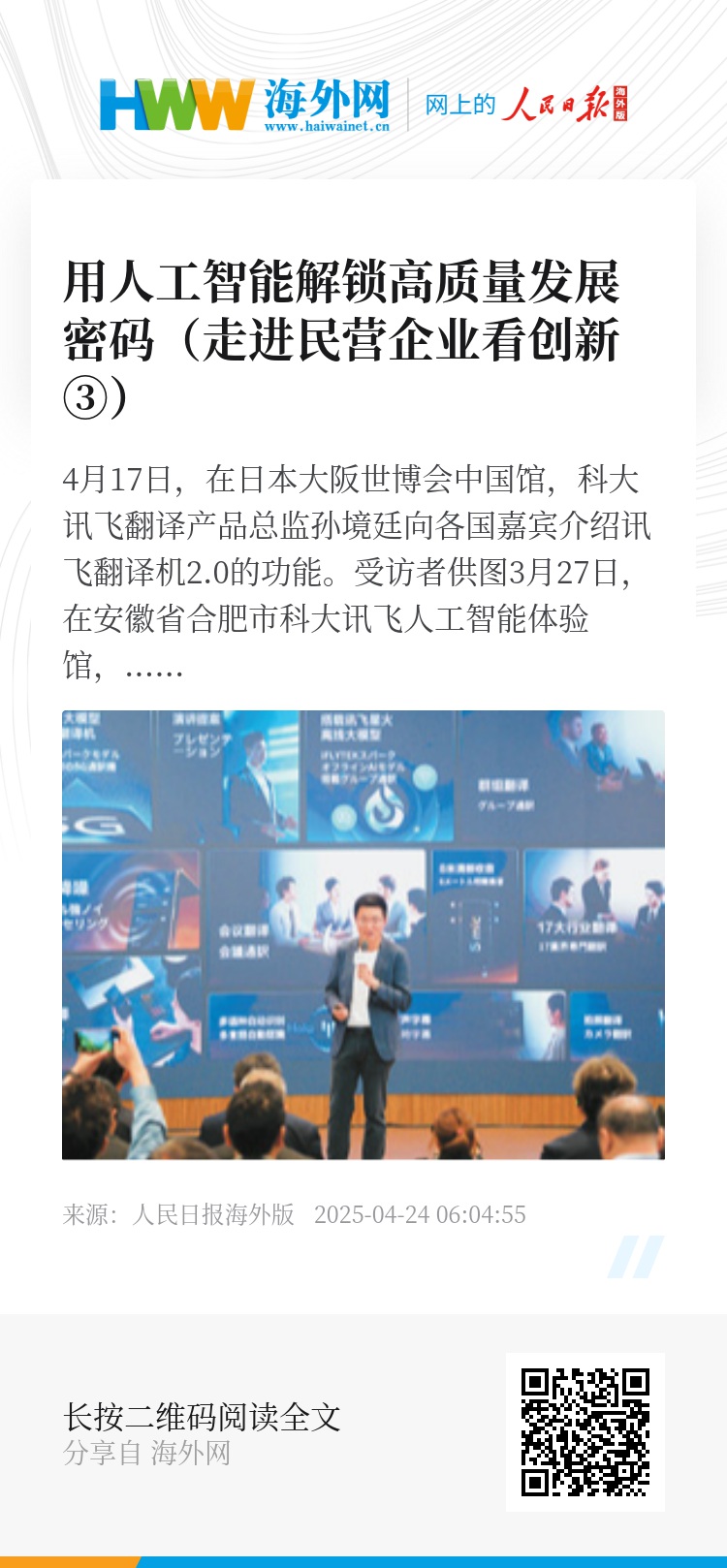 4月17日,讯飞双屏翻译机2.0在大阪世博会中国馆正式亮相。在向各国嘉宾推荐这款翻译机时,科大讯飞AI主持人沐沐说:“我们相信真正的翻译技术不只是字句的转换,还应成为文明之间对话的引路人。能在世界文明荟聚的舞台上与诸位共同开启人类沟通变革的新篇章,科大讯飞深感荣幸。”