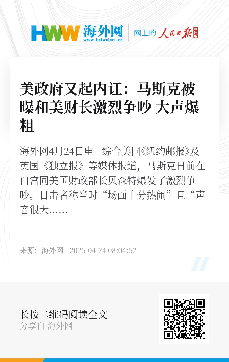 海外网4月24日电 综合美国《纽约邮报》及英国《独立报》等媒体报道,马斯克日前在白宫同美国财政部长贝森特爆发了激烈争吵。