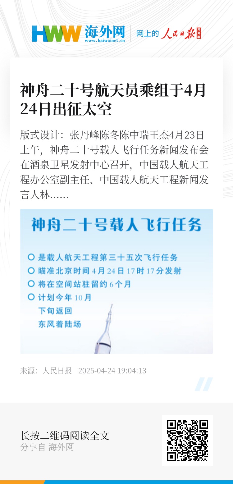 按计划,神舟二十号载人飞船入轨后,将采用自主快速交会对接模式,约6.5小时后对接于天和核心舱径向端口,形成三船三舱组合体。在轨驻留期间,神舟二十号航天员乘组将迎来天舟九号货运飞船和神舟二十一号载人飞船的来访,计划于今年10月下旬返回东风着陆场。神舟十九号航天员乘组在与神舟二十号航天员乘组完成在轨轮换后,计划于本月29日返回东风着陆场。