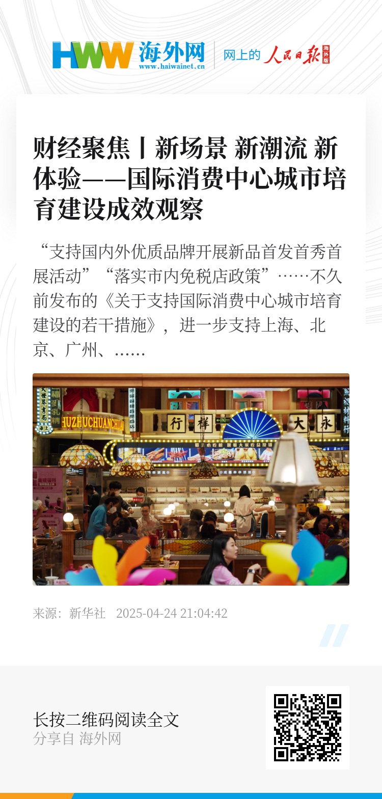 “支持国内外优质品牌开展新品首发首秀首展活动”“落实市内免税店政策”……不久前发布的《关于支持国际消费中心城市培育建设的若干措施》,进一步支持上海、北京、广州、天津、重庆加快国际消费中心城市培育建设,打造具有全球吸引力的消费环境。