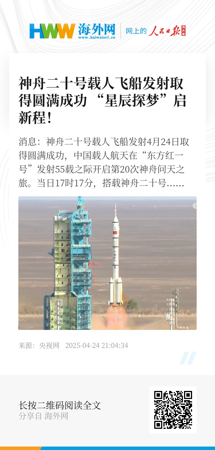 央视网消息:神舟二十号载人飞船发射4月24日取得圆满成功,中国载人航天在“东方红一号”发射55载之际开启第20次神舟问天之旅。