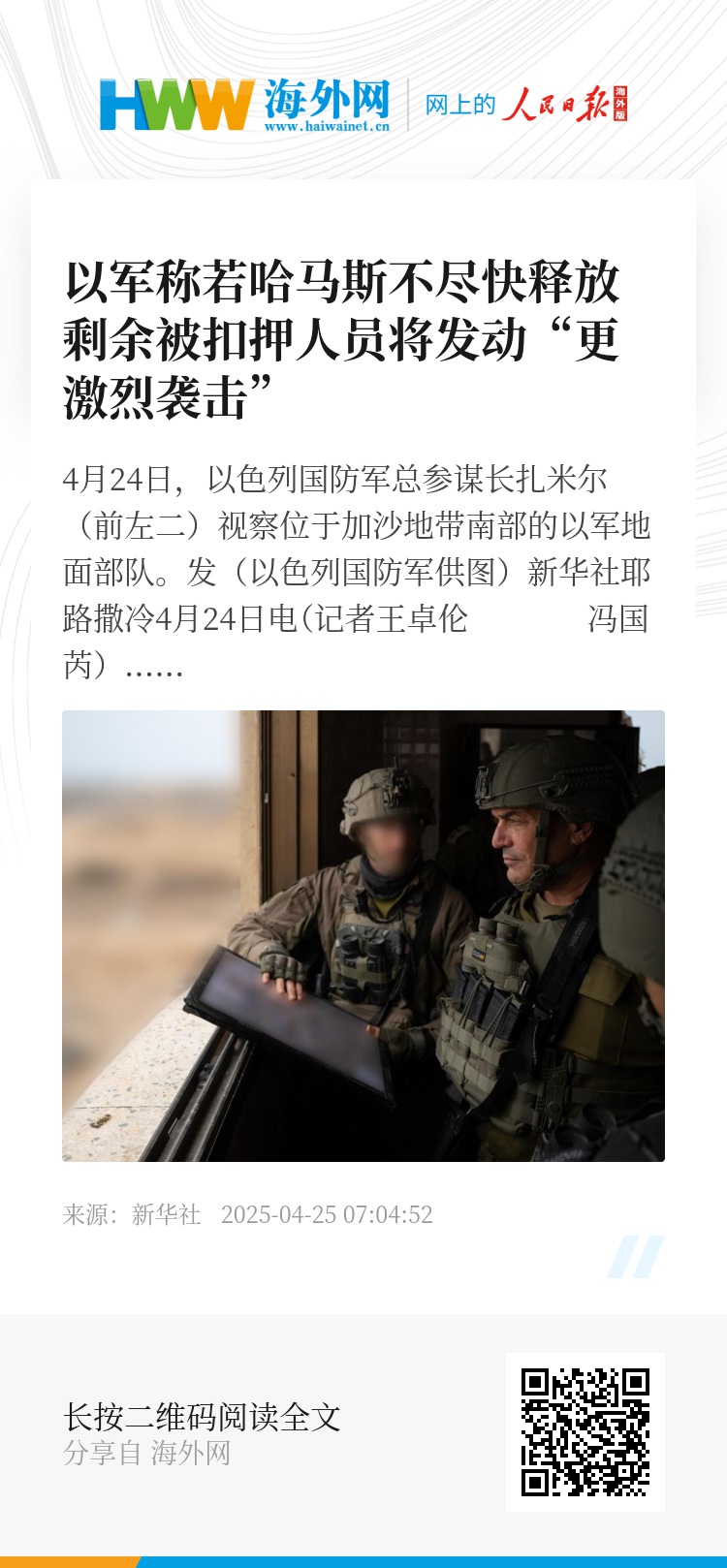 新华社耶路撒冷4月24日电(记者王卓伦 冯国芮)以色列国防军总参谋长扎米尔24日说,如果巴勒斯坦伊斯兰抵抗运动(哈马斯)不尽快释放加沙地带剩余的被扣押人员,以军将在加沙地带发动“更激烈袭击”,直至取得决定性成果。