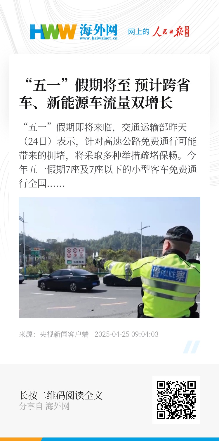 今年五一假期7座及7座以下的小型客车免费通行全国收费公路时间为5月1日0时至5月5日24时。预计五一假期全国高速公路日均流量约为6200万辆,跨省车流量与新能源车流量双增长。新能源汽车日均流量占日均总流量近20%,同比明显增长。4月30日18点至20点为节前高峰时段;5月1日假期首日,跨省中长途出行集中,10—12点将出现出城拥堵高峰;5月4日开始,返程高峰显现,时段性拥堵突出,16—18点将出现返程拥堵高峰。