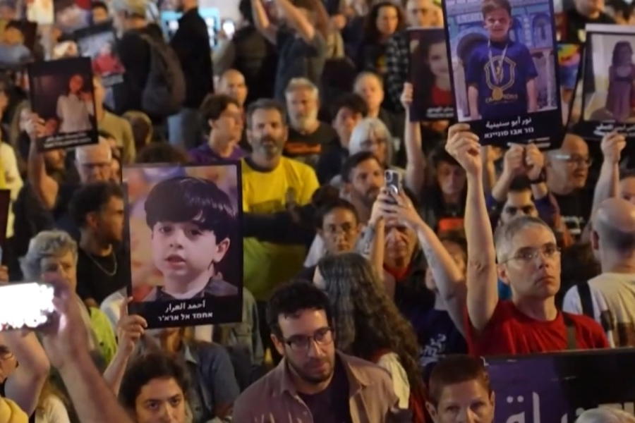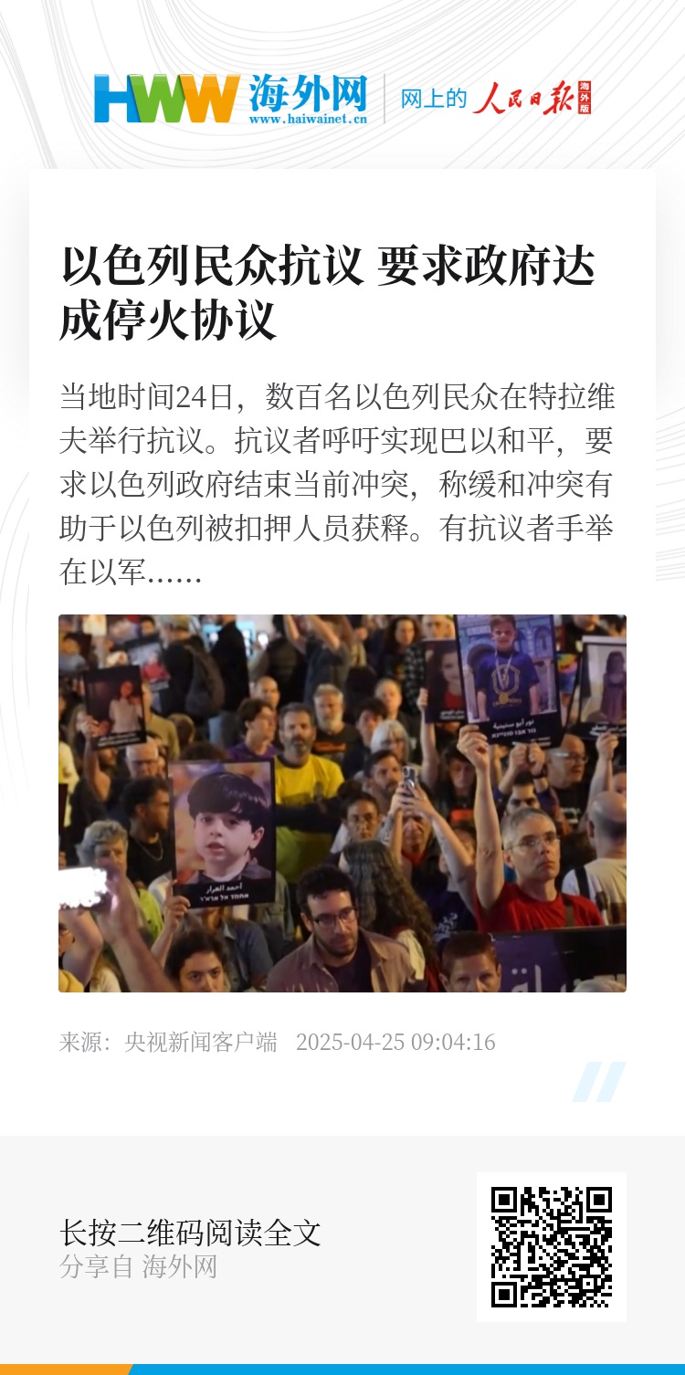 当地时间24日,数百名以色列民众在特拉维夫举行抗议。抗议者呼吁实现巴以和平,要求以色列政府结束当前冲突,称缓和冲突有助于以色列被扣押人员获释。