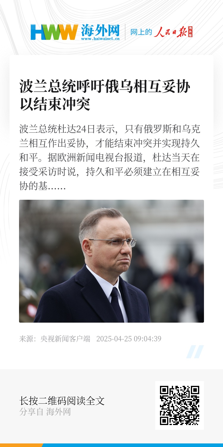 波兰总统杜达24日表示,只有俄罗斯和乌克兰相互作出妥协,才能结束冲突并实现持久和平。