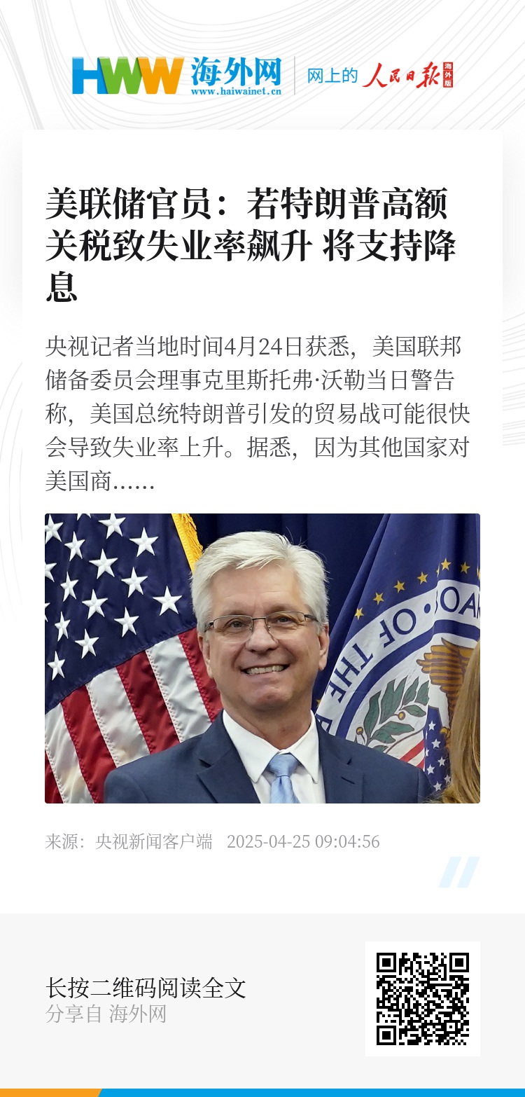 沃勒强调,一旦劳动力市场出现严重恶化,他预计很快会有更多降息。(央视记者 刘旭)