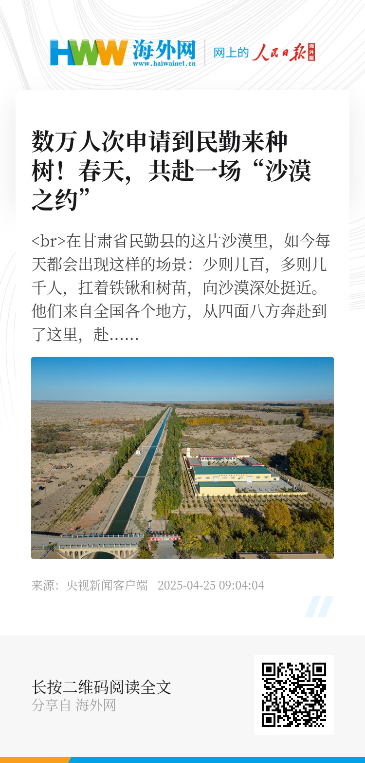 在甘肃省民勤县的这片沙漠里,如今每天都会出现这样的场景:少则几百,多则几千人,扛着铁锹和树苗,向沙漠深处挺近。他们来自全国各个地方,从四面八方奔赴到了这里,赴一场春天的约定。