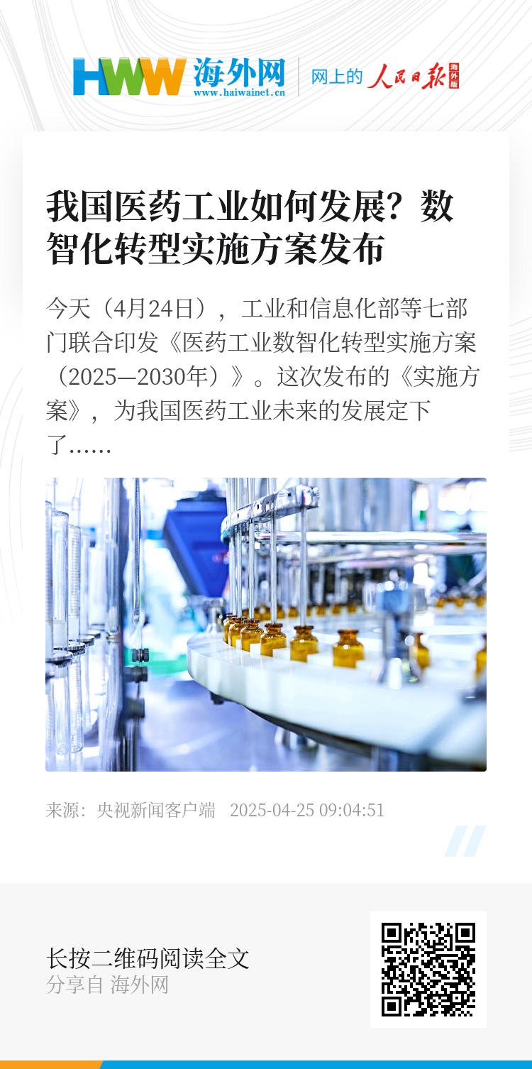 今天(4月24日),工业和信息化部等七部门联合印发《医药工业数智化转型实施方案(2025—2030年)》。这次发布的《实施方案》,为我国医药工业未来的发展定下了几个目标。