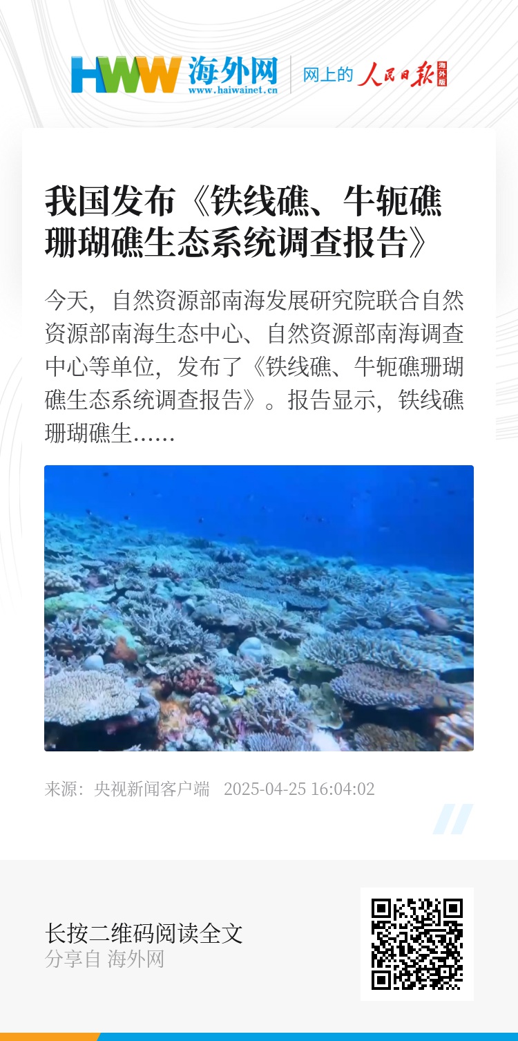 今天,自然资源部南海发展研究院联合自然资源部南海生态中心、自然资源部南海调查中心等单位,发布了《铁线礁、牛轭礁珊瑚礁生态系统调查报告》。报告显示,铁线礁珊瑚礁生态系统退化严重,牛轭礁珊瑚礁生态系统健康。