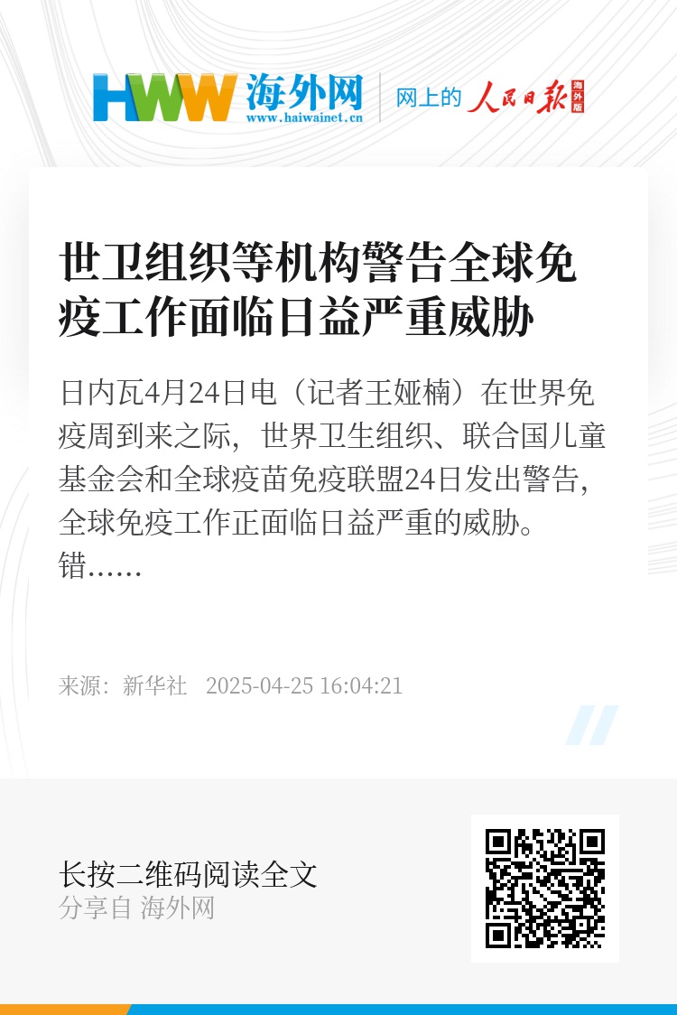 新华社日内瓦4月24日电(记者王娅楠)在世界免疫周到来之际,世界卫生组织、联合国儿童基金会和全球疫苗免疫联盟24日发出警告,全球免疫工作正面临日益严重的威胁。错误信息、人口增长、人道主义危机和资金削减等因素阻碍了免疫工作的进展,致使数百万人面临健康风险。