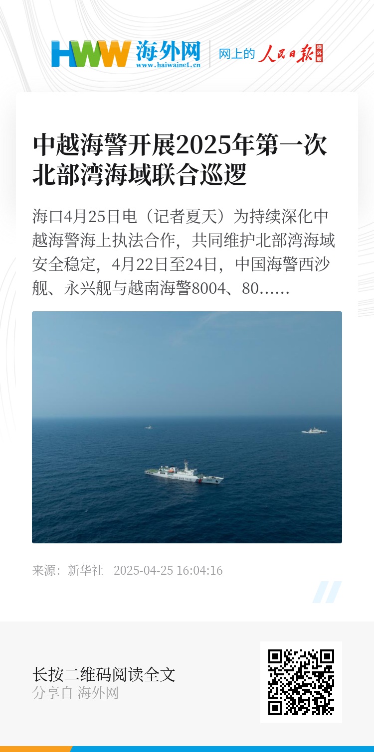 新华社海口4月25日电(记者夏天)为持续深化中越海警海上执法合作,共同维护北部湾海域安全稳定,4月22日至24日,中国海警西沙舰、永兴舰与越南海警8004、8003船开展了2025年第一次北部湾海域联合巡逻。这是2006年以来中越海上执法部门开展的第29次联合巡逻。