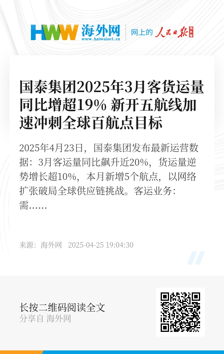 2025年4月23日,国泰集团发布最新运营数据:3月客运量同比飙升近20%,货运量逆势增长超10%,本月新增5个航点,以网络扩张破局全球供应链挑战。
