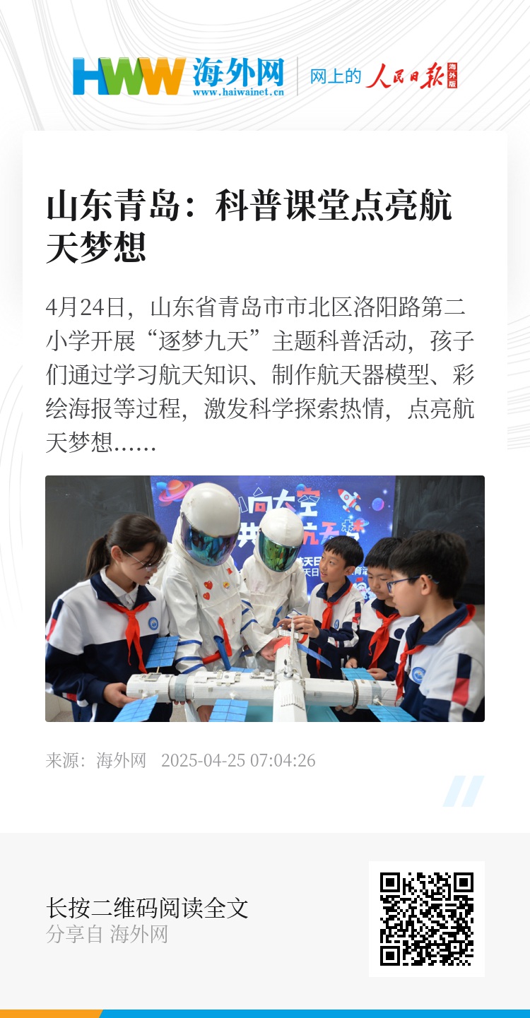 4月24日,山东省青岛市市北区洛阳路第二小学开展“逐梦九天”主题科普活动,孩子们通过学习航天知识、制作航天器模型、彩绘海报等过程,激发科学探索热情,点亮航天梦想。图源:IC photo