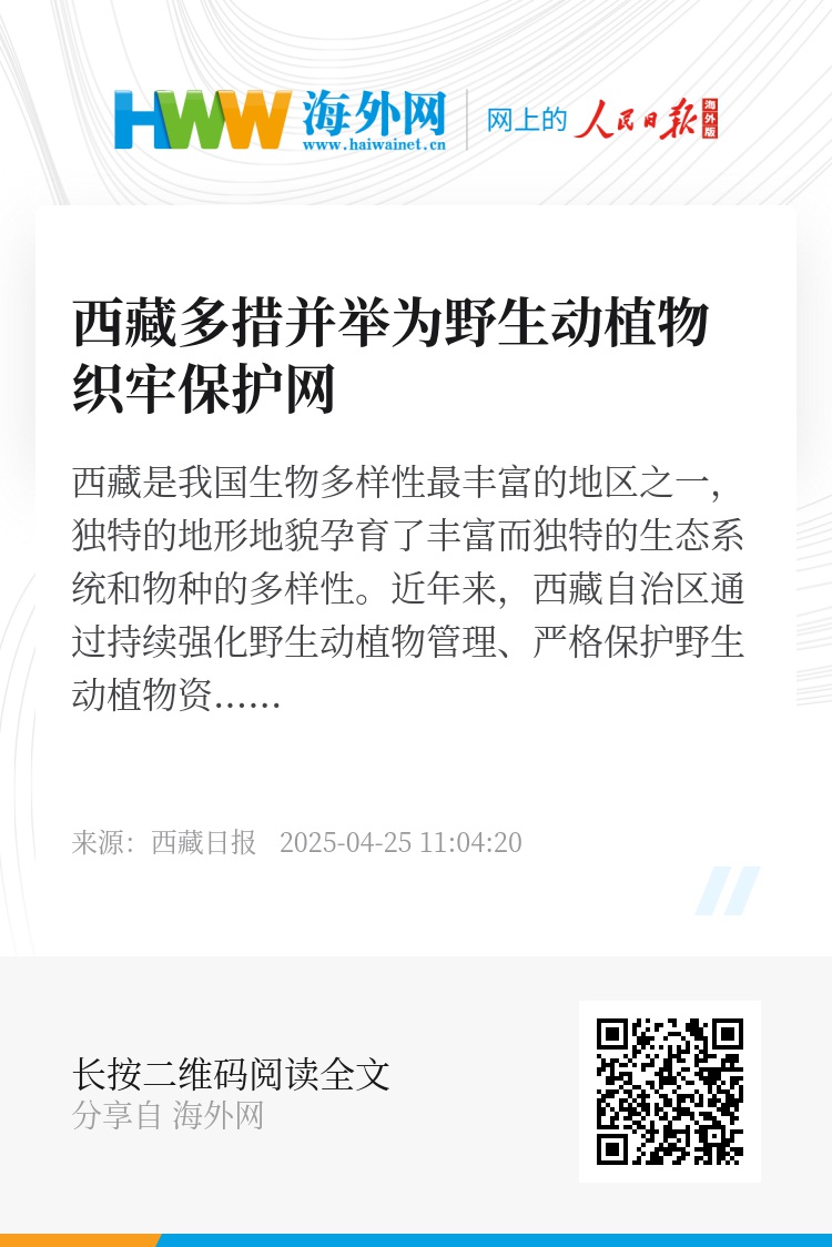 近年来,西藏自治区通过持续强化野生动植物管理、严格保护野生动植物资源和栖息地、保护生物多样性,多措并举加大保护力度,为野生动植物撑起强有力的保护伞,促进了人与自然和谐共生。