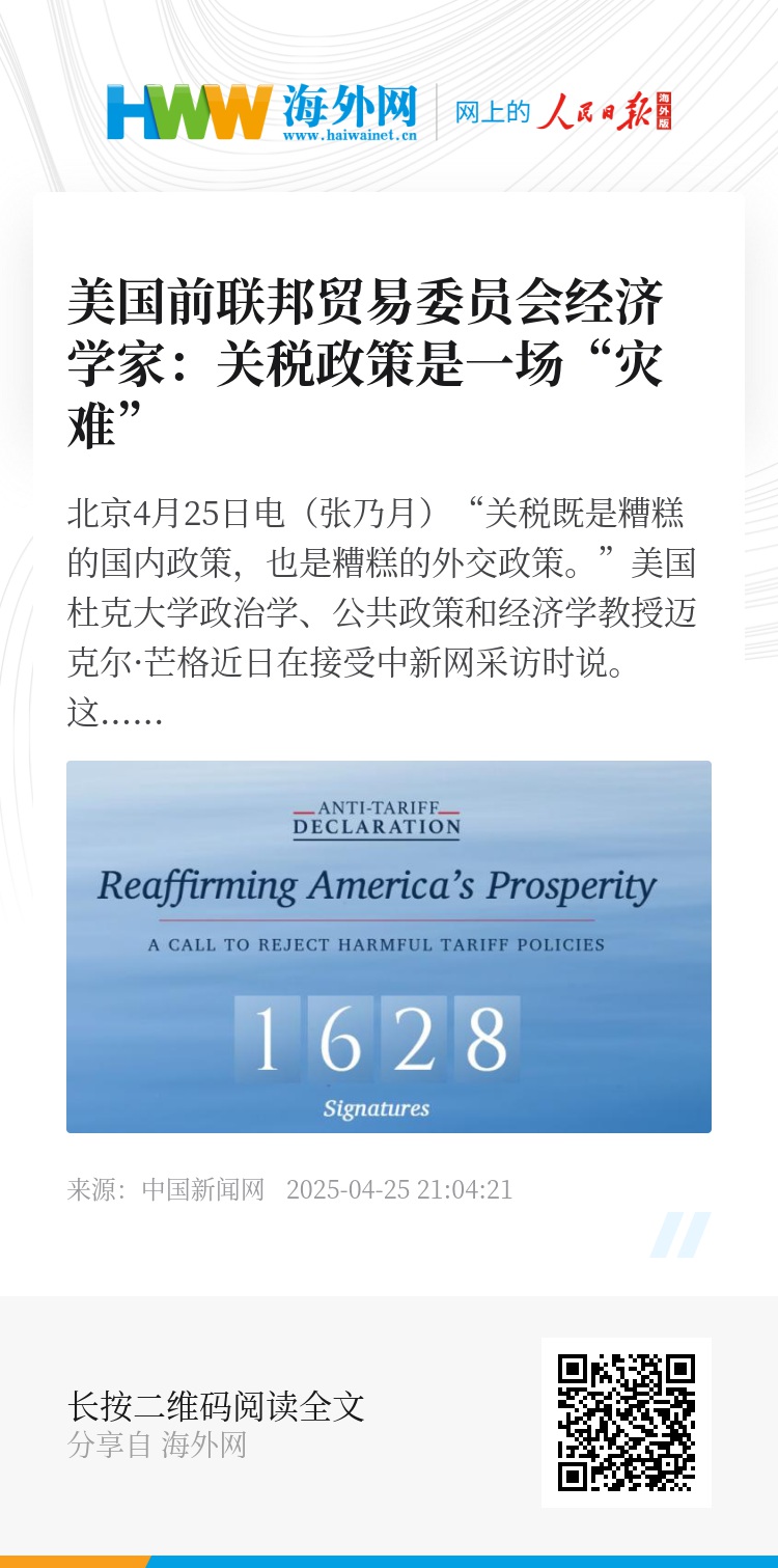 该宣言已吸引1600多位经济学家签名联署,其中不乏诺贝尔经济学奖得主与前总统经济顾问,批评特朗普政府采取的关税政策是对普通美国人所面临的经济状况的错误理解。他们警告,这可能引发一场“自我造成的经济衰退”。