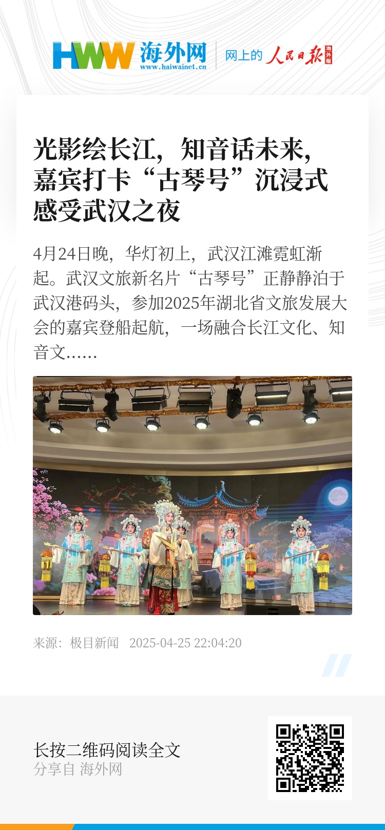 4月24日晚,华灯初上,武汉江滩霓虹渐起。武汉文旅新名片“古琴号”正静静泊于武汉港码头,参加2025年湖北省文旅发展大会的嘉宾登船起航,一场融合长江文化、知音文化与非遗传承的沉浸式展演,在粼粼波光中徐徐展开。