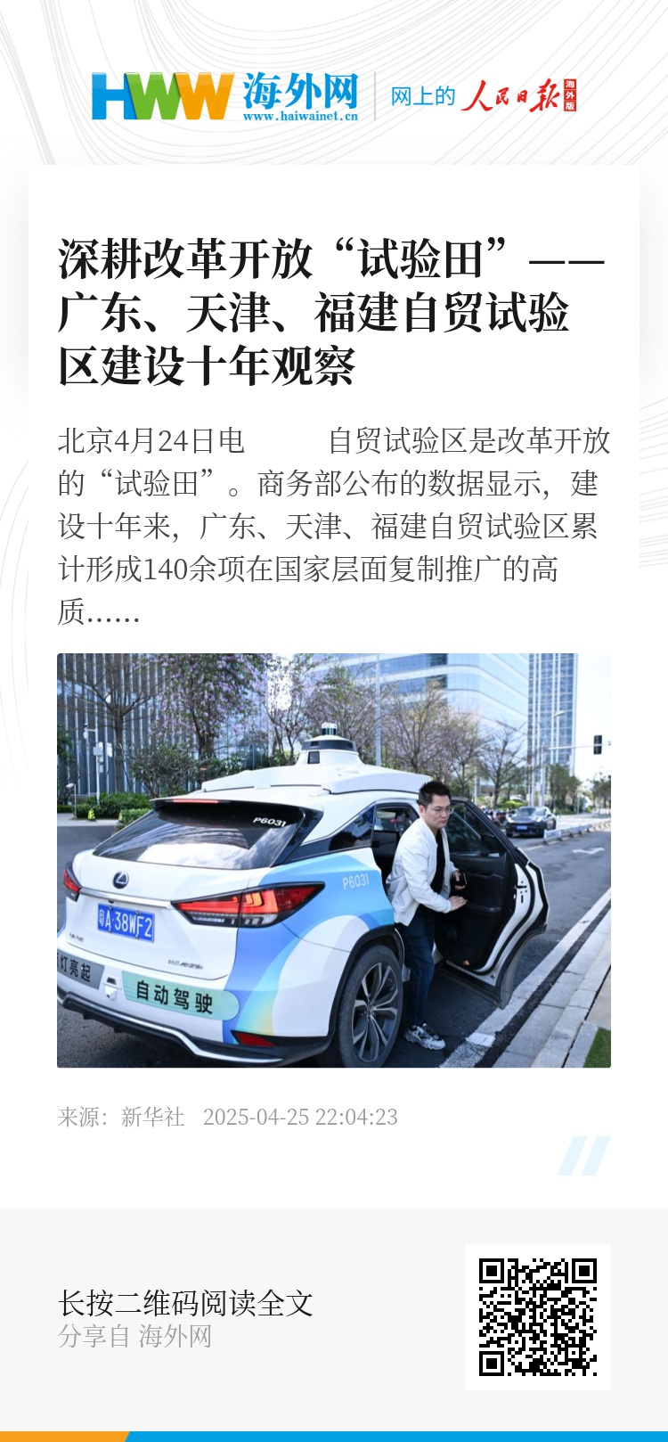 新华社北京4月24日电 自贸试验区是改革开放的“试验田”。商务部公布的数据显示,建设十年来,广东、天津、福建自贸试验区累计形成140余项在国家层面复制推广的高质量制度创新成果。记者近日在3个自贸试验区调研时看到,三地因地制宜深入开展差别化探索,首创性、集成式改革试验成效显著,高水平制度型开放试点持续落地,不断为相关行业创新发展提供“自贸方案”。